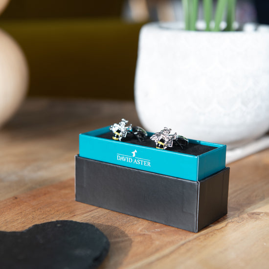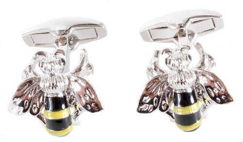 Our Bee cufflinks are wonderfully detailed with black and yellow stripes and silver wings. A great summer-time shirt accessory, these can be personalised using our in-house engraving service.