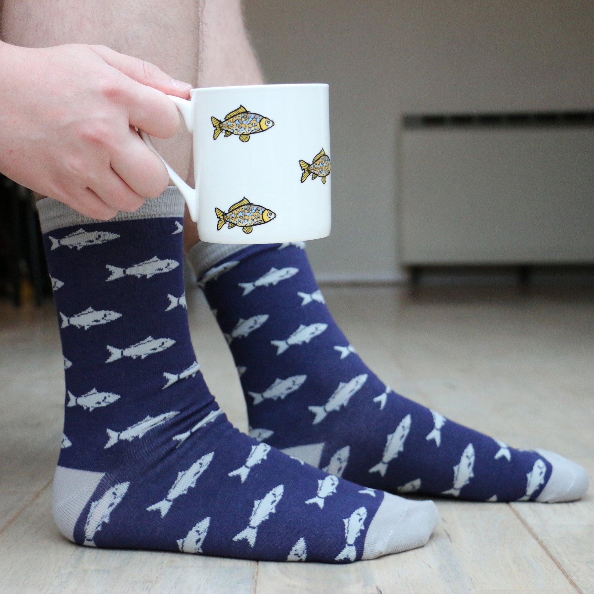 Created exclusively for us by the British artist Hannah Keuls, this mug is made using quality fine bone china and is dishwasher and microwave safe. Available in a large 370 ml size, our mugs are perfect for those indulgent cups of tea. The eye catching fish design is repeated all the way around the mug.
