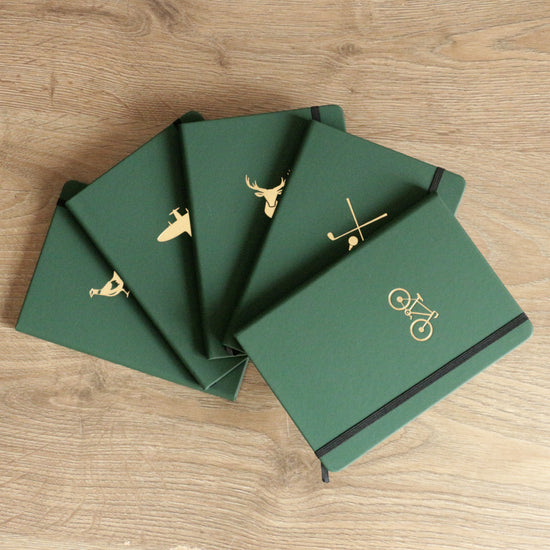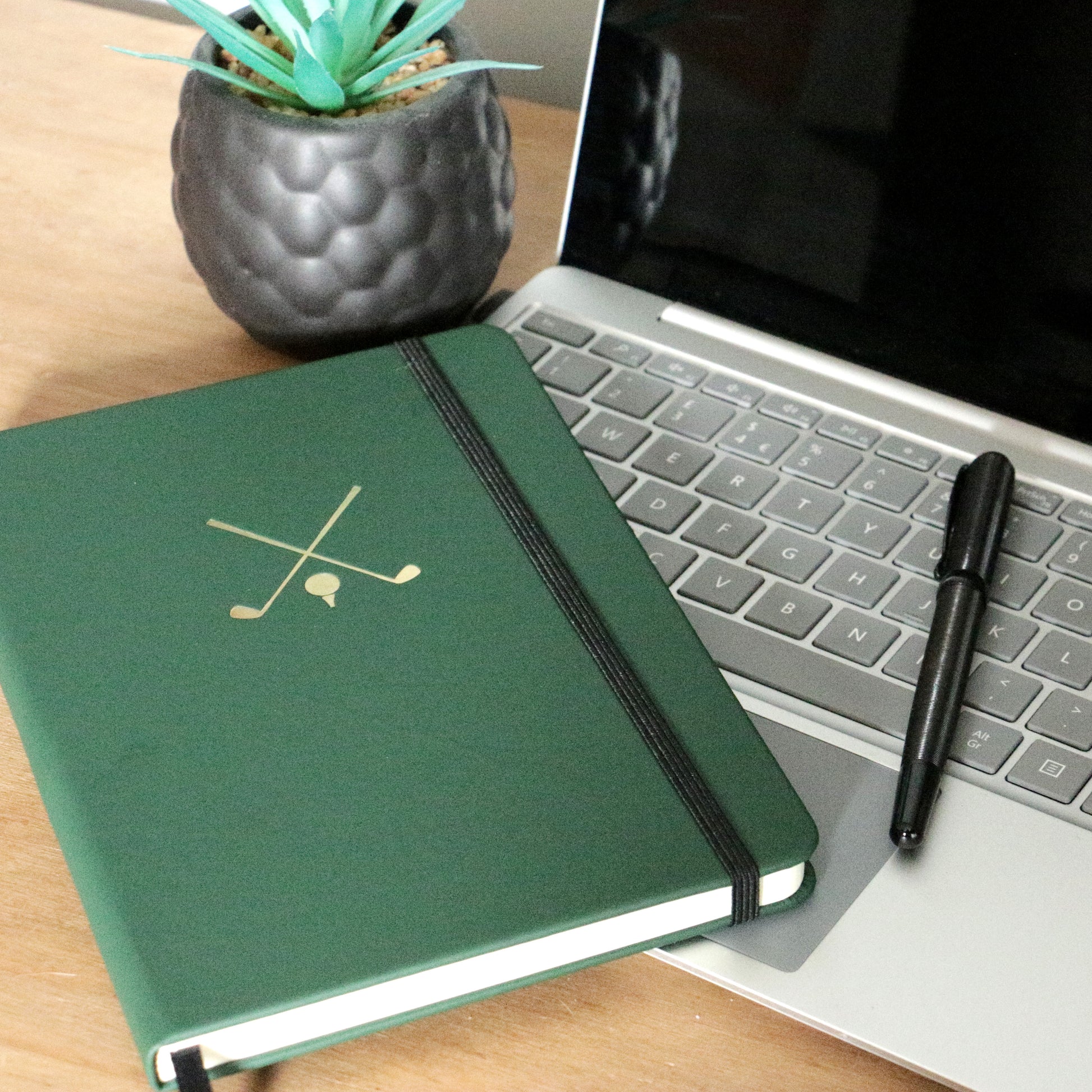 Our Golfing themed Gold Foil Embossed Notebook is a smart racing green colour.