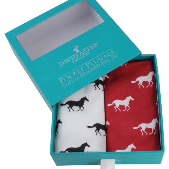 Red & White Horse Print Handkerchief Set, the perfect gift for a horse loving gent! Measuring 34cm square, these hankies can also double up as a smart pocket square too. Made from 100% cotton and supplied in our David Aster Pocket Plumage gift box, these make a luxurious gift.