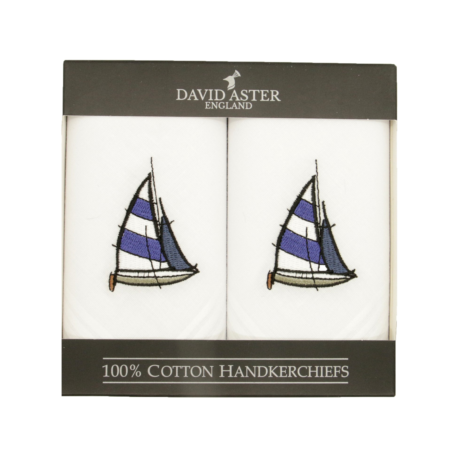 Our Yacht Handkerchief Set features 2 beautifully embroidered blue and white sailing yachts, made from 100% cotton. Measuring approximately 30cm square, these hankies come packaged in our smart eco-friendly David Aster branded box, making them the perfect gift for a sailing enthusiast.