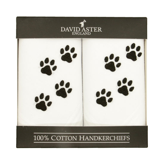 The perfect gift for a dog lover! Our dog paw print design handkerchiefs are made using 100% cotton with the paws embroidered in black.